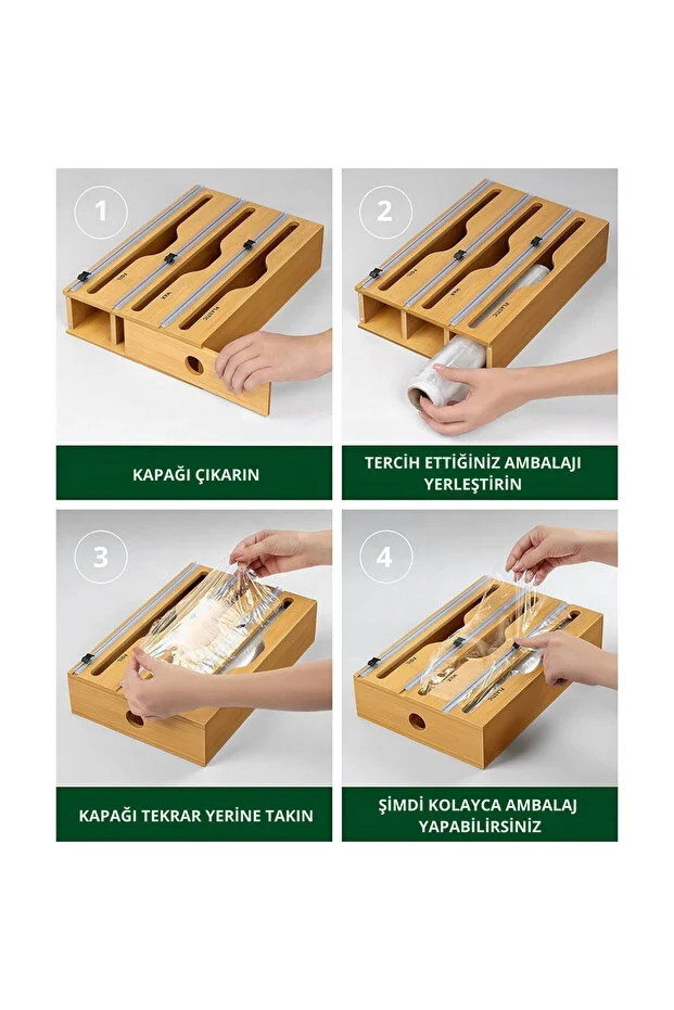 - Bölmeler: 3 adet Folyo/Streç Film/Yağlı Kâğıt Bölmesi (Kesicili)