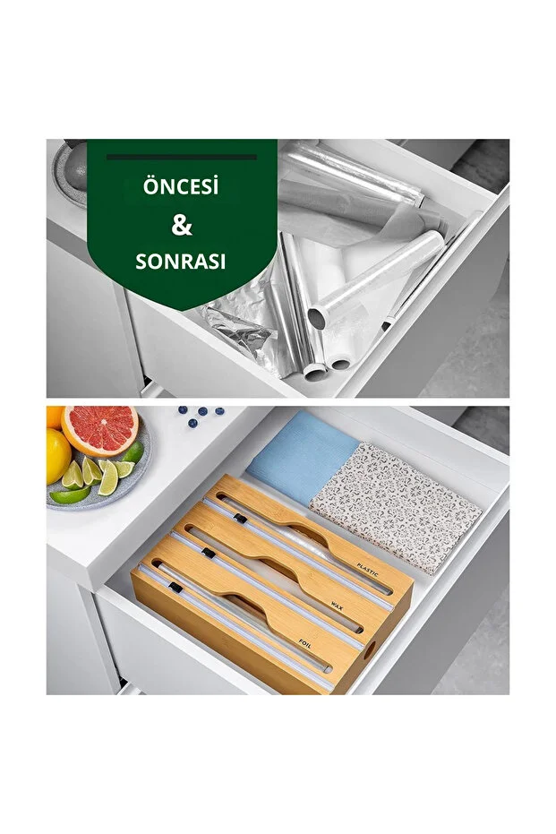 - ✨ Hepsi Bir Yerde Düzen: Bu akıllı stant sayesinde streç filminiz, alüminyum folyonuz ve yağlı kâğıdınız her zaman elinizin altında ve düzenli bir şekilde durur. Mutfak tezgahınızda ve çekmecelerinizde değerli yerden tasarruf edin.